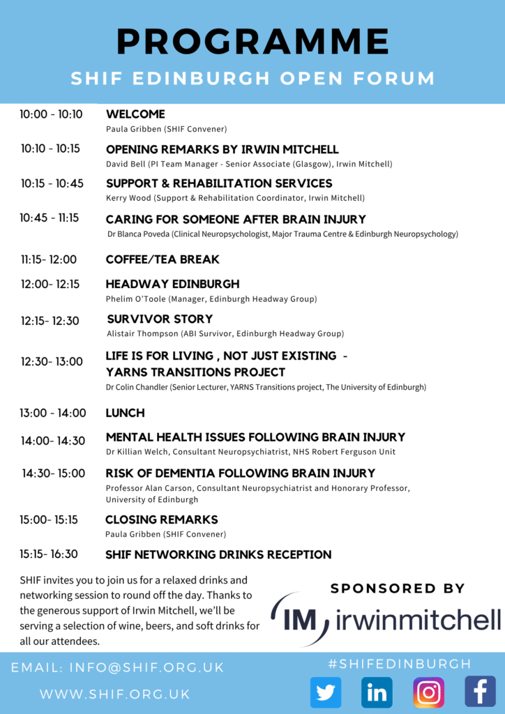 We are a registered Scottish Charity, founded in 1993. SHIF is a national umbrella organisation representing the interests of survivors of brain injuries, their families, and those who work with them through our 3 annual conferences across Scotland.